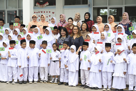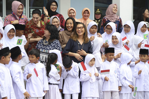 Ibu negara Brasil Janja Lula da Silva berfoto dengan para guru dan siswa saat melihat pendistribusian MBG di SD Angkasa 05, Jakarta Timur, Jumat (24/10/2025). Foto: Iqbal Firdaus/kumparan