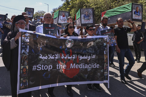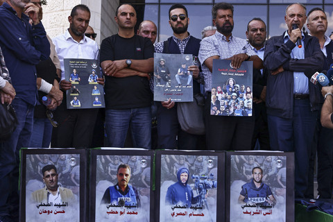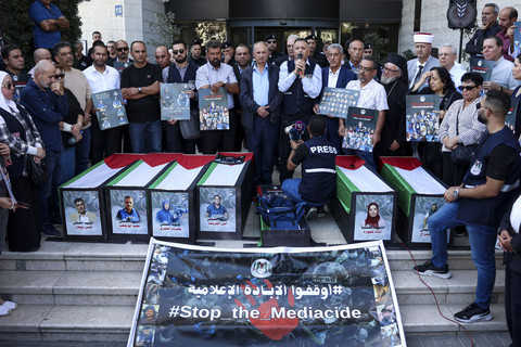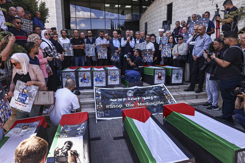 Para jurnalis Palestina dan pejabat lokal berkumpul di sekitar peti mati yang menjadi simbolis serta potret para pekerja media yang tewas akibat serangan dari Israel, dalam sebuah aksi yang digelar di Ramallah, Tepi Barat, Palestina, Rabu (8/10/2025).