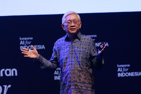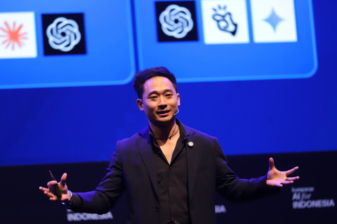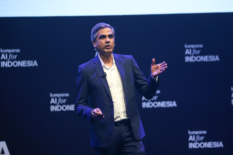 Chief of AI & Corporate Strategy kumparan Andrias Ekoyuono memberikan opening remark pada acara kumparan AI for Indonesia 2025 di The Ballroom at Djakarta Theater, Jakarta Pusat, Kamis (23/10/2025). Foto: Jamal Ramadhan/kumparan