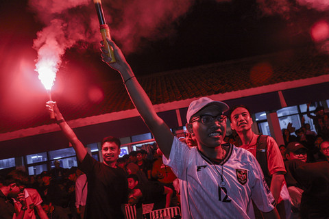 Euforia dukungan terhadap Timnas Indonesia menggema di kawasan Duren Sawit, Jakarta Timur, Kamis (9/10) malam WIB. Ratusan suporter berkumpul dalam acara nonton bareng (nobar) laga Ronde 4 Kualifikasi Piala Dunia 2026 zona Asia antara Timnas Indonesia melawan Timnas Arab Saudi.