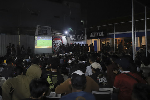 Sejumlah suporter Timnas Indonesia nonton bareng saat menyaksikan laga Timnas Indonesia melawan Timnas Arab Saudi dalam pertandingan ronde keempat Kualifikasi Piala Dunia 2026 zona Asia di kawasan Duren Sawit, Jakarta Timur, Kamis (9/10/2025). Foto: Darryl Ramadhan/kumparan