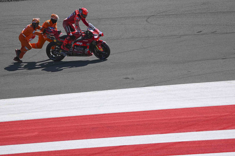 Sejumlah marshal mendorong sepeda motor pembalap Ducati Lenovo Team Marc Marquez usai terjatuh dalam sesi practice MotoGP Indonesia 2025 di tikungan 11 Sirkuit Internasional Pertamina Mandalika, Lombok Tengah, Nusa Tenggara Barat, Jumat (3/10/2025). Foto: Aditya Pradana Putra/ANTARA FOTO