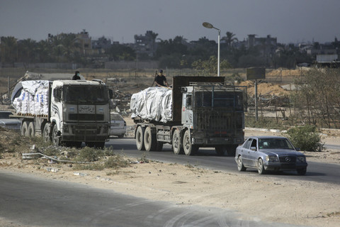 Sejumlah truk yang membawa bantuan melintasi jalan di Deir el-Balah, wilayah tengah Jalur Gaza, Rabu (15/10) waktu setempat.