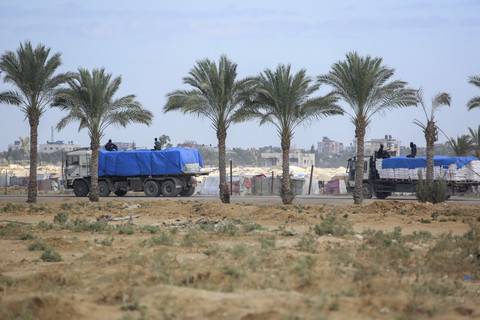 Tiga truk yang membawa bantuan untuk Gaza melintas di Deir el-Balah, wilayah tengah Jalur Gaza, Rabu (15/10/2025). Foto: Bashar Taleb/AFP