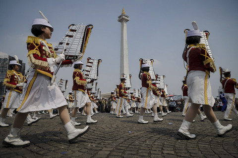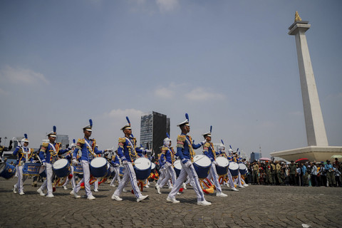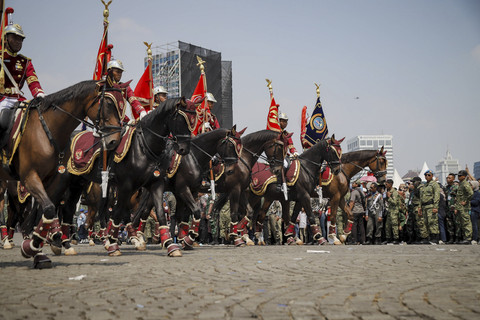 Pasukan dari berbagai Matra TNI berjalan saat defile pasukan di kawasan Monas, Jakarta, Minggu (5/10/2025).