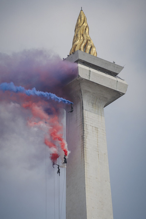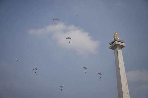 Selain defile, penonton juga disuguhkan atraksi terjun payung dan demo aksi penyelamatan yang dilakukan di tugu Monas.