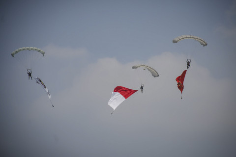 Aksi penerjun kibarkan bendera Merah Putih dalam peringatan Hari Ulang Tahun (HUT) ke-80 Tentara Nasional Indonesia (TNI) di Lapangan Silang Monumen Nasional (Monas), Jakarta Pusat, Minggu (5/10/2025). Foto: Jamal Ramadhan/kumparan