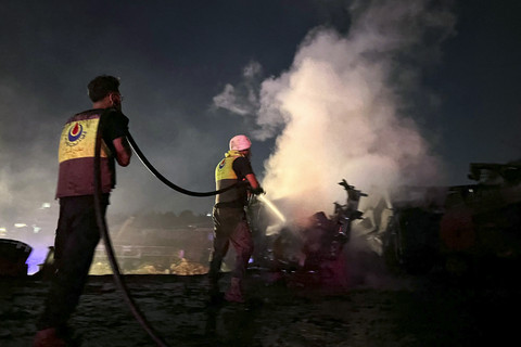 Petugas pemadam kebakaran memadamkan api di lokasi serangan udara Israel semalam di wilayah Al-Msayleh, Lebanon selatan, Sabtu (1/10).