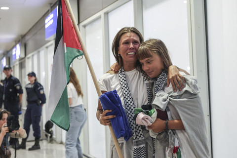 Aktivis asal Swedia Greta Thunberg berpelukan bersama seorang peserta lainnya saat tiba di Bandara Internasional Eleftherios Venizelos Athena, di Athena, Yunani, Senin (6/10/2025).