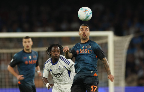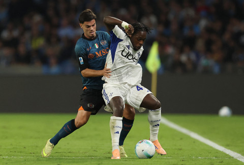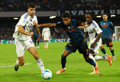Ivan Smolcic dari Como beraksi bersama David Neres dari Napoli pada pertandingan Liga Italia antara Napoli vs Como di Stadio Diego Armando Maradona, Naples, Italia, Minggu (2/11/2025) dini hari WIB. Foto: Ciro De Luca/REUTERS