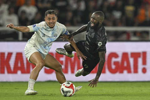 Pemain Persija Jakarta Cardoso (kiri) berusaha melewati hadngan pemain PSIM Yogyakarta Abiyoso (kanan) dalam pertandingan lanjutan Super League 2025 di Stadion Utama Gelora Bung Karno (SUGBK), Jakarta, Jumat (28/11/2025) Foto: Rivan Awal Lingga/ANTARA FOTO