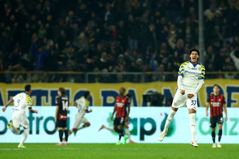 Selebrasi pemain Parma usai mencetak gol ke gawang AC Milan pada pertandingan Liga Italia di Stadio Ennio Tardini, Parma, Italia, Sabtu (8/11/2025). Foto: Ciro De Luca/REUTERS