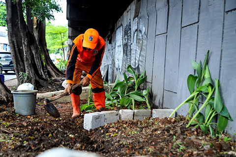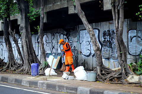 Petugas Penanganan Prasarana dan Sarana Umum (PPSU) Kelurahan Bidara Cina mempercantik kolong Flyover Kampung Melayu, Bidara Cina, Jakarta Timur, Rabu (12/11/2025). Foto: Iqbal Firdaus/kumparan