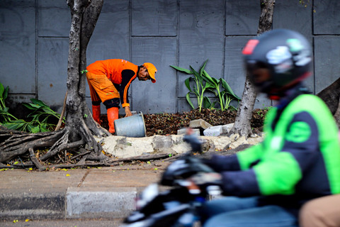 Petugas Penanganan Prasarana dan Sarana Umum (PPSU) Kelurahan Bidara Cina mempercantik kolong Flyover Kampung Melayu, Bidara Cina, Jakarta Timur, Rabu (12/11).