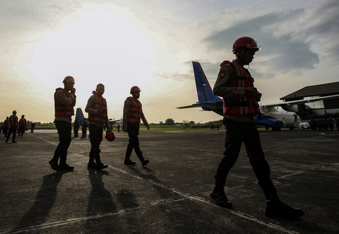 Personel Polri berjalan usai mengikuti apel persiapan pemberangkatan ke daerah bencana alam di wilayah Sumatera, yang digelar di Direktorat Kepolisian Udara, Bandara Pondok Cabe, Tangerang Selatan, Banten, Sabtu (29/11/2025).