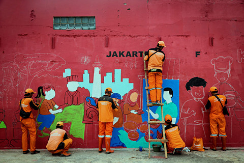 Sejumlah pekerja dari PPSU Srengseng Sawah bersama Dinas Pertamanan dan Hutan Kota Jakarta Selatan terlihat melakukan pembuatan mural bertema fauna dan kota Jakarta serta menata area taman di sekitarnya.