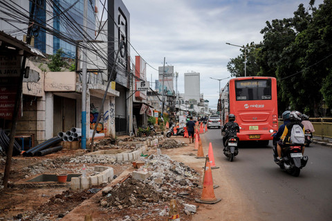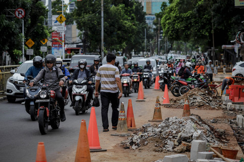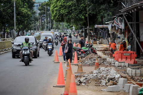 Akibat proyek tersebut jalan menyempit, sehingga menimbulkan kepadatan lalu lintas dan membuat pejalan kaki berjalan di tengah jalan yang tampak berbahaya.