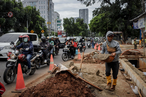 Pejalan kaki berjalan di tengah jalan raya di samping proyek galian di Jalan Dr. Soepomo, Jakarta, Rabu (12/11/2025).
