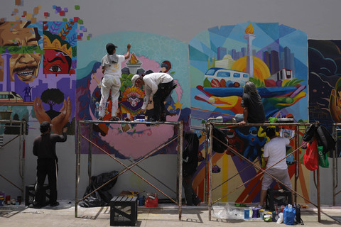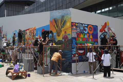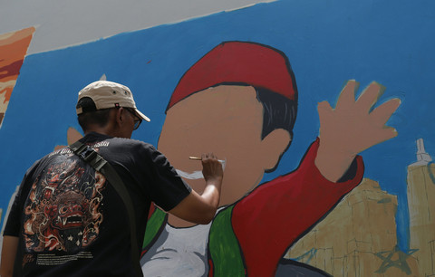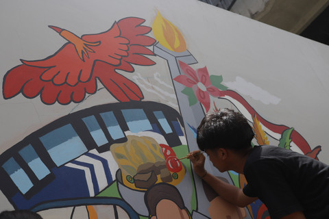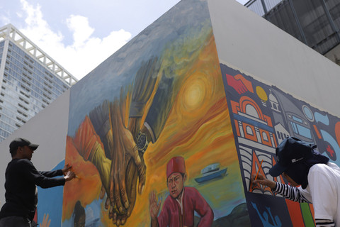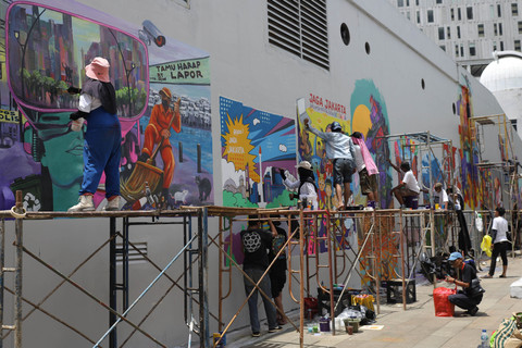 Seniman menggambar mural dalam Jakarta Mural Festival 2025 di kompleks Taman Ismail Marzuki (TIM), Cikini, Jakarta, Minggu (16/11/2025).