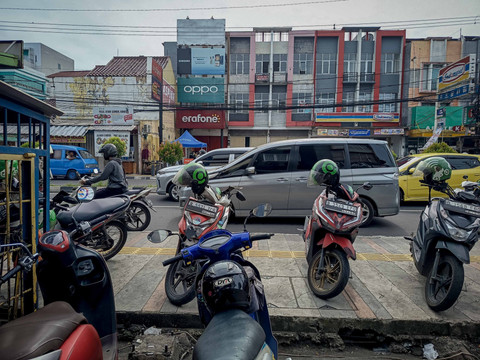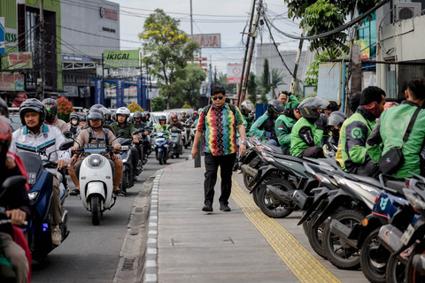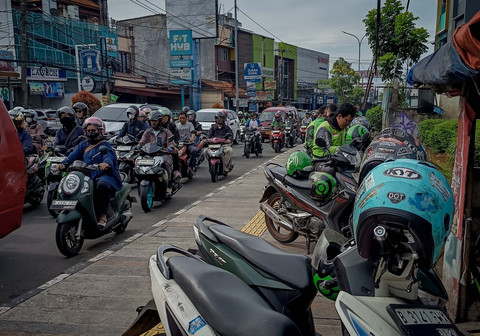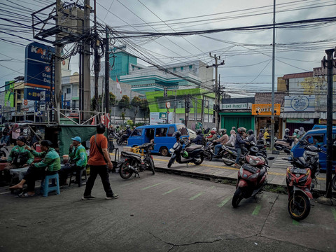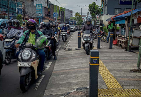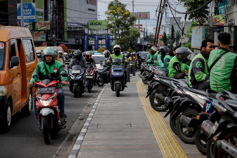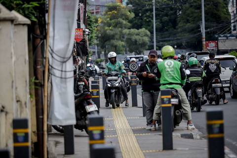 Trotoar yang seharusnya digunakan untuk pejalan kaki itu dipenuhi pengendara ojek online yang mangkal menunggu penumpang.