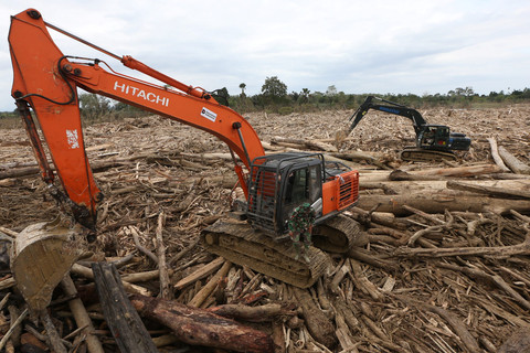 Sejumlah alat berat diterjunkan untuk memudahkan pembersihan gelondongan kayu dan lumpur akibat luapan sungai Tamiang.