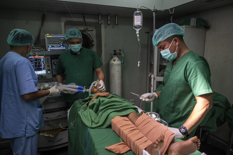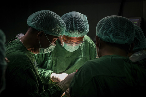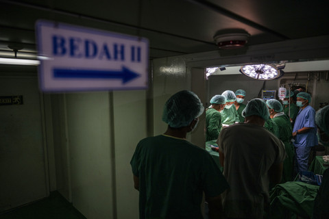Dokter Spesialis Bedah bersama tim medis Satgas TNI AL melakukan operasi di Ruang Operasi Rumah Sakit KRI dr Soeharso-990, Perairan Aceh Tamiang, Aceh, Jumat (12/12).