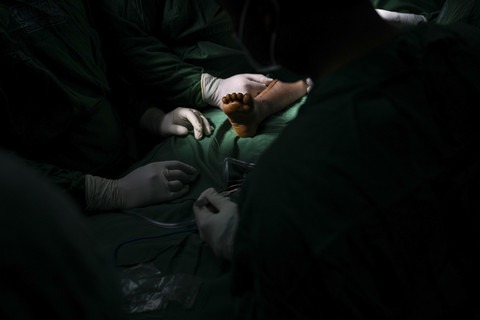 Mayor Laut (K) dr Helmy Fahada (kedua kiri) bersama Dokter Spesialis Bedah Charles Apulta Meliala (kedua kanan) melakukan operasi kaki di Ruang Operasi Rumah Sakit KRI dr Soeharso-990, Perairan Aceh Tamiang, Aceh, Jumat (12/12/2025). Foto: Bayu Pratama S/ANTARA FOTO