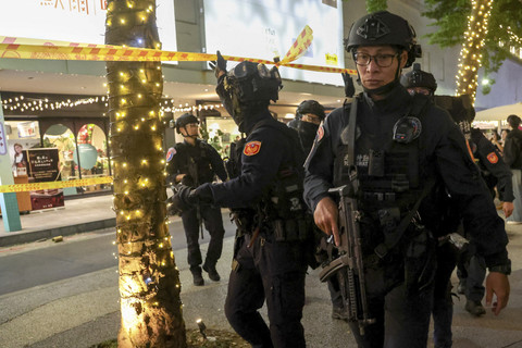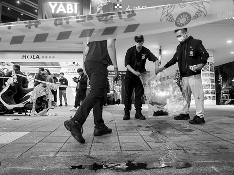 Petugas polisi berdiri di samping bekas darah setelah setelah seseorang melepaskan bom asap dan menyerang pejalan kaki di luar toko Eslite Spectrum Nanxi dekat Stasiun Zhongshan, Taiwan, Jumat (19/12/2025). Foto: Ann Wang/Reuters