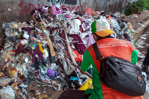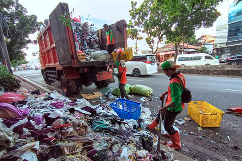 Petugas Suku Dinas Lingkungan Hidup (Sudin LH) Kota Administrasi Jakarta Selatan mengangkut tumpukan sampah konveksi yang berada di trotoar kawasan Warung Buncit, Jakarta Selatan, Rabu (10/12/2025). Foto: Jamal Ramadhan/kumparan