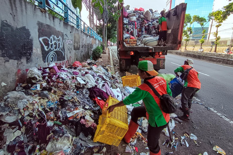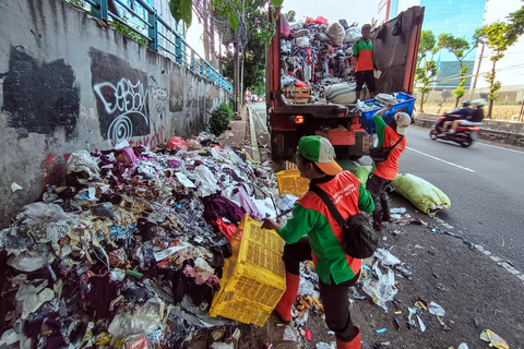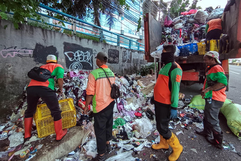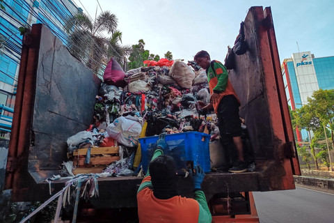Tampak petugas Suku Dinas Lingkungan Hidup (Sudin LH) Kota Administrasi Jakarta Selatan mengangkut tumpukan sampah itu dalam truk.