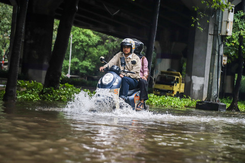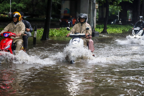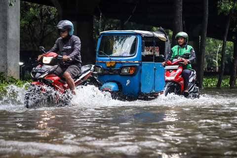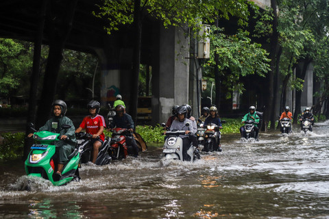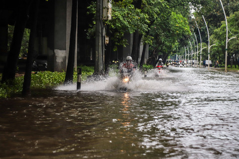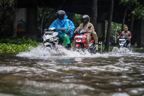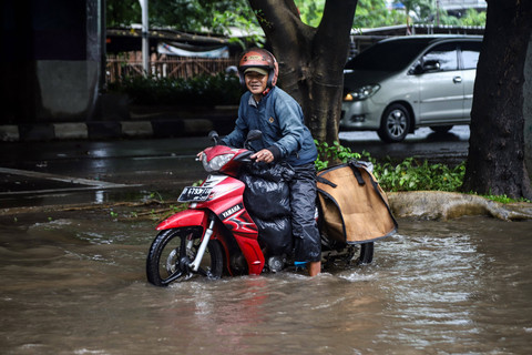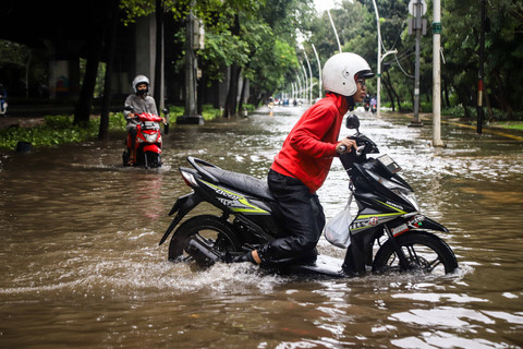 Foto: Aksi Pengendara Motor Terjang Banjir di Cempaka Putih