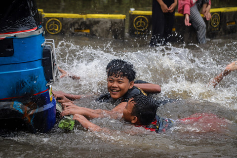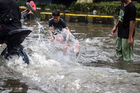 Di sisi lain, banjir justru menjadi wahana bermain dadakan bagi anak-anak di sekitar lokasi. Mereka tampak bermain air di tengah genangan.