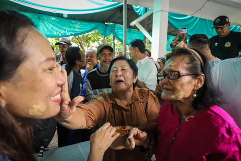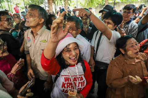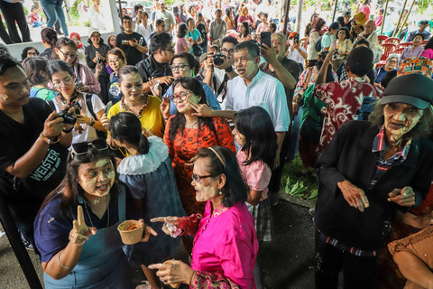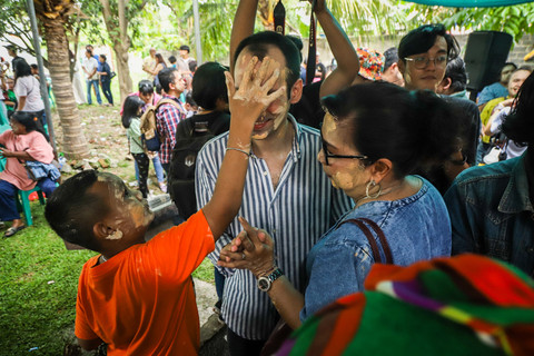 Warga yang tergabung dalam Komunitas Ikatan Keluarga Besar Tugu (IKBT) saling mencorengkan bedak saat mengikuti acara adat dan budaya Mandi-mandi di Kampung Tugu, Cilincing, Jakarta, Minggu (4/1/2026). Foto: Iqbal Firdaus/kumparan