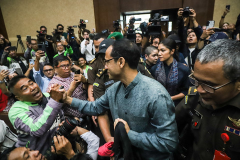 Di dalam ruang sidang, ia memeluk sejumlah anggota keluarganya yang telah menunggu sejak pagi, termasuk sang ayah, Nono Anwar Makarim, dan ibunya, Atika Algadrie, serta sambutan tepuk tangan oleh para pendukungnya di ruang sidang.