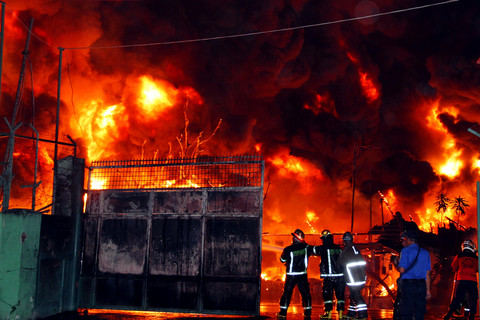 Petugas pemadam kebakaran berupaya memadamkan api yang membakar sebuah pabrik sandal di Kota Medan, Sumatera Utara, Rabu (28/1). Kebakaran tersebut terjadi sejak Selasa (27/1) sekitar pukul 22.00 WIB.