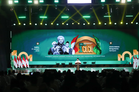 Hari Lahir Ke-100 NU ini mengangkat tema Mengawal Indonesia Merdeka, Menuju Peradaban Mulia yang diselenggarkan di Istora Senayan, Jakarta pada Sabtu (31/01). Foto: Jamal Ramadhan/kumparanGus Yahya juga menjelaskan bahwa visi ini menjadi cita-cita berdirinya Jamiyyah NU. Tema itu juga berkesinambungan dengan Harlah 1 Abad NU versi Hijriah. Foto: Jamal Ramadhan/kumparanAcara puncak Harlah NU ke-100 dihadiri jajaran pengurus PBNU pusat, pengurus wilayah dan cabang NU dari seluruh Indonesia, serta sejumlah tokoh nasional. Foto: Jamal Ramadhan/kumparanAcara tersebut dihadiri pejabat seperti Ketua MPR RI Ahmad Muzani, Menteri Agama Nasarudin Umar, Istri Alm Gus Dur Sinta Nuriyah, dan Menko PMK Pratikno. Foto: Jamal Ramadhan/kumparanAcara tersebut dihadiri pejabat seperti Ketua MPR RI Ahmad Muzani, Menteri Agama Nasarudin Umar, Istri Alm Gus Dur Sinta Nuriyah, dan Menko PMK Pratikno. Foto: Jamal Ramadhan/kumparanRangkaian acara diisi dengan Istighotsah Kubro, Mahallul Qiyam, doa rapat akbar, serta penggalangan donasi untuk korban bencana di Sumatera. Peringatan ini diharapkan menjadi simbol kebersamaan dan penguatan semangat persatuan warga Nahdliyin. Foto: Jamal Ramadhan/kumparanRangkaian acara diisi dengan Istighotsah Kubro, Mahallul Qiyam, doa rapat akbar, serta penggalangan donasi untuk korban bencana di Sumatera. Foto: Jamal Ramadhan/kumparanPeringatan ini diharapkan menjadi simbol kebersamaan dan penguatan semangat persatuan warga Nahdliyin. Foto: Jamal Ramadhan/kumparanSementara itu, Presiden Prabowo Subianto yang dijadwalkan hadir pada puncak peringatan Harlah NU ke-100 belum terlihat di lokasi. Foto: Jamal Ramadhan/kumparanAcara tersebut dihadiri pejabat seperti Ketua MPR RI Ahmad Muzani, Menteri Agama Nasarudin Umar, Istri Alm Gus Dur Sinta Nuriyah, dan Menko PMK Pratikno. Foto: Jamal Ramadhan/kumparanRangkaian acara diisi dengan Istighotsah Kubro, Mahallul Qiyam, doa rapat akbar, serta penggalangan donasi untuk korban bencana di Sumatera. Peringatan ini diharapkan menjadi simbol kebersamaan dan penguatan semangat persatuan warga Nahdliyin. Foto: Jamal Ramadhan/kumparanKetua MPR RI Ahmad Muzani menyampaikan sambutan pada Harlah ke-100 tahun NU di Istora Senayan, Jakarta, Sabtu (31/1/2026). Foto: Jamal Ramadhan/kumparanSuasana di Istora saat Hari Lahir Ke-100 NU. Foto: Jamal Ramadhan/kumparanSuasana di Istora saat Hari Lahir Ke-100 NU. Foto: Jamal Ramadhan/kumparanSuasana di Istora saat Hari Lahir Ke-100 NU. Foto: Jamal Ramadhan/kumparan