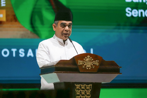 Ketua PBNU Yahya Cholil Staquf menyampaikan sambutan pada Harlah ke-100 tahun NU di Istora Senayan, Jakarta, Sabtu (31/1/2026). Foto: Jamal Ramadhan/kumparan