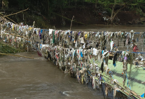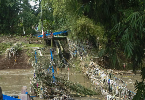 Berdasarkan pantauan di lokasi, struktur jembatan gantung tersebut tampak hancur. Material sampah plastik dalam jumlah besar terlihat tersangkut di antara lilitan tali baja jembatan.
