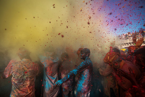Sejumlah umat Hindu mengikuti perayaan keagamaan Holi di dalam kuil di Desa Nandgaon, Uttar Pradesh, India, Kamis (26/2). Tradisi yang dikenal sebagai "Festival Warna" atau "Festival Kasih Sayang" ini menjadi salah satu perayaan musim semi Hindu yang meriah, biasanya berlangsung pada bulan Maret di India dan Nepal. Holi menandai berakhirnya musim dingin sekaligus simbol kemenangan kebaikan atas kejahatan.