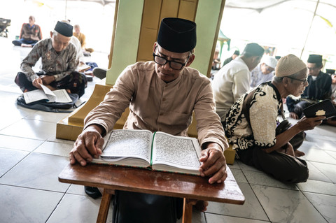 Sejumlah warga membaca Al Quran saat mengikuti semaan Al Quran atau pengajian tafsir Al Quran di Masjid Agung Kauman Semarang, Jawa Tengah, Minggu (1/3/2026). Foto: Aprillio Akbar/ANTARA FOTO