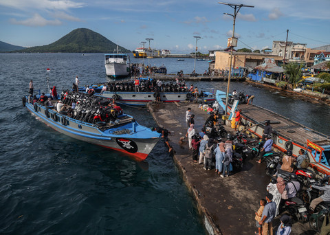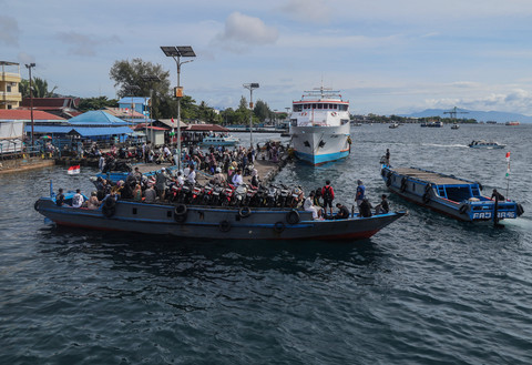 Sejumlah warga beserta kendaraannya diangkut secara bergantian menggunakan perahu kayu bermotor untuk melintasi perairan antara Ternate dan Tidore. Antrean terlihat di area pelabuhan, seiring tingginya jumlah penumpang yang ingin menyeberang.