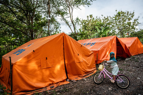 Seorang anak pengungsi korban bencana geologi tanah bergerak bermain sepeda di dekat tenda darurat Kelurahan Jangli, Tembalang, Semarang, Jawa Tengah, Rabu (8/4/2026). Foto: Aprillio Akbar/ANTARA FOTO